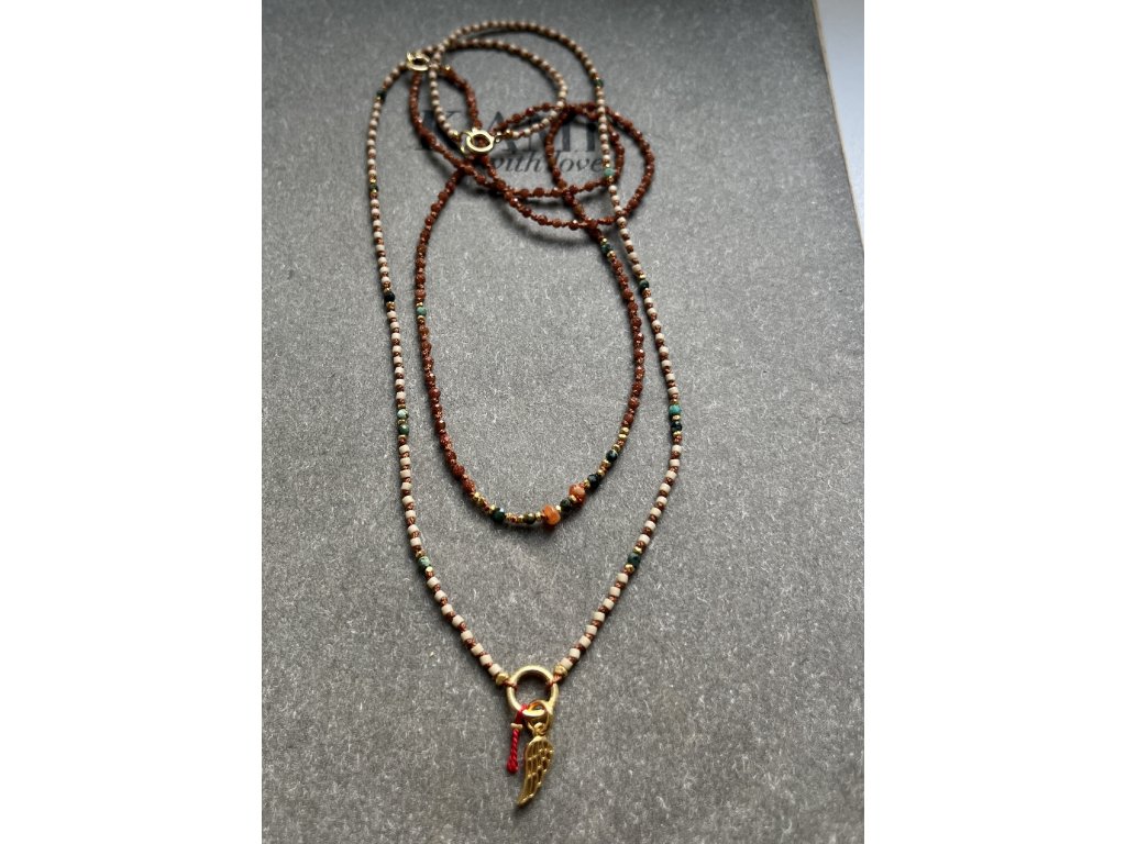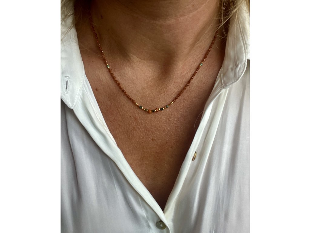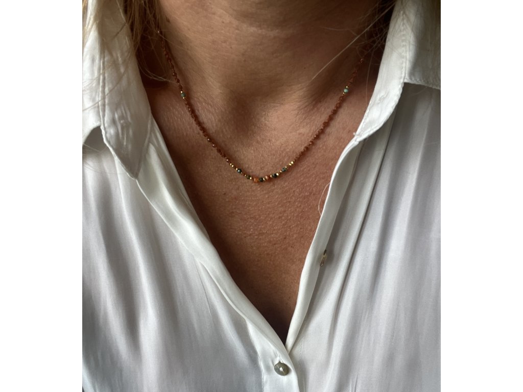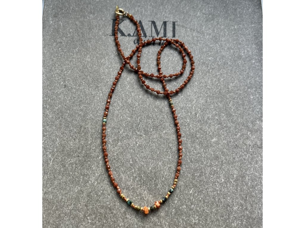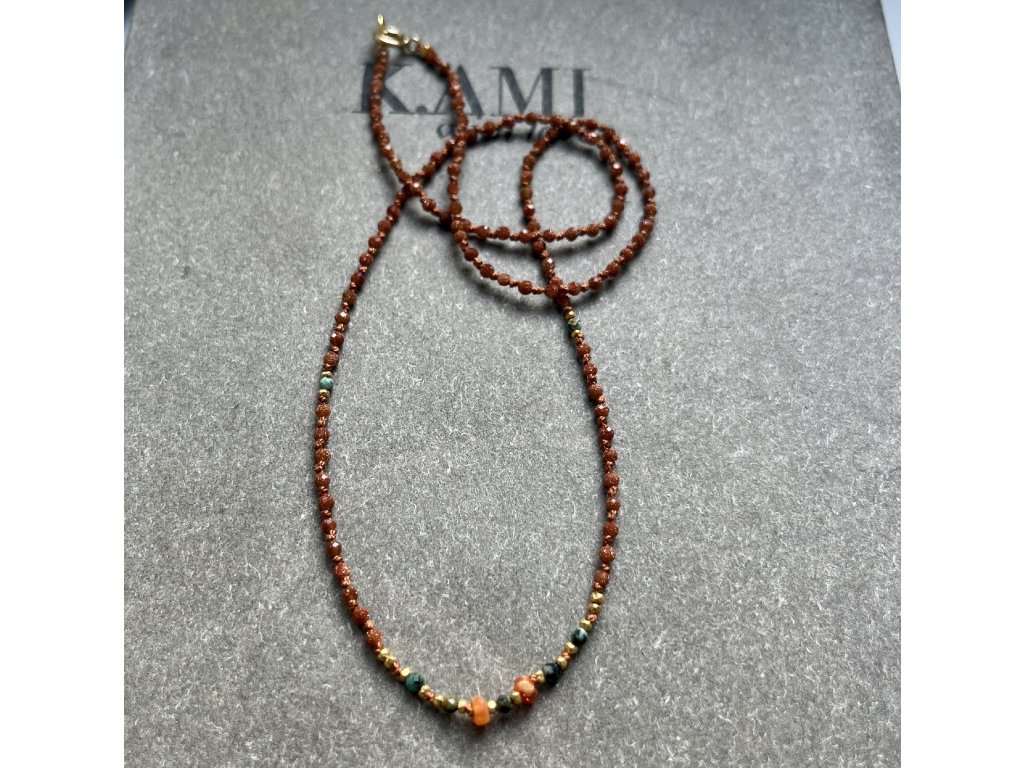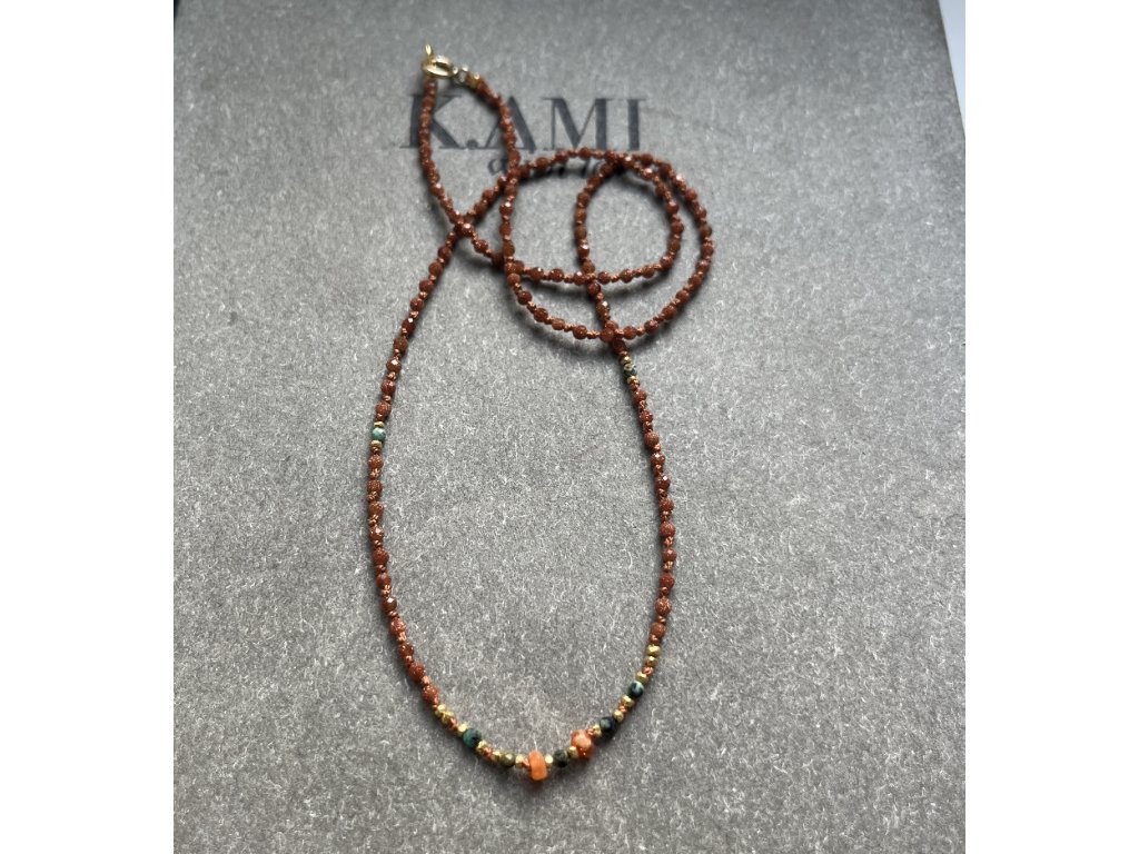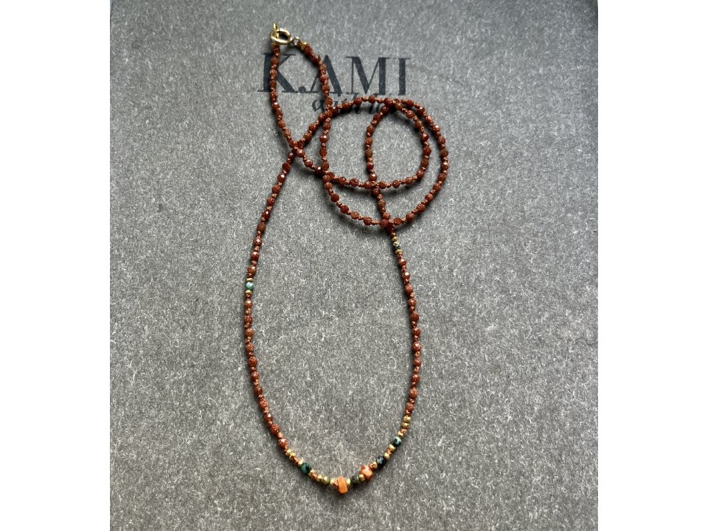 Nádherný elegantní ručně dělaný řetízek z kamene sand stone s africkými tyrkysy, zlacenými fazetami (Ag925) a mexickými opály, zlacené zapínání (Ag925).