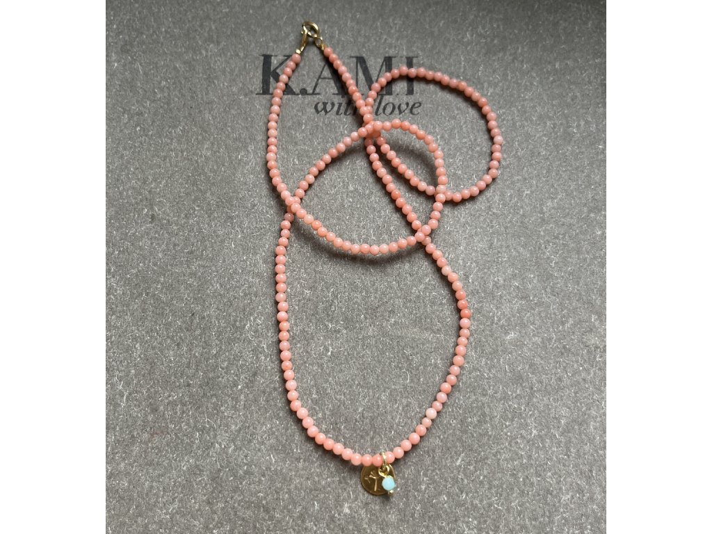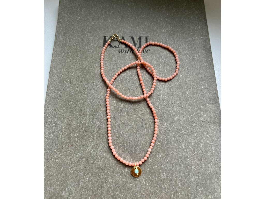 Řetízek z korálu se zlacenou pampeliškou (Ag925) a kamínkem (amazonit), zlacené zapínání (Ag925).