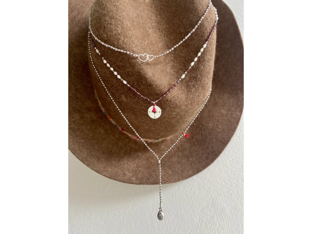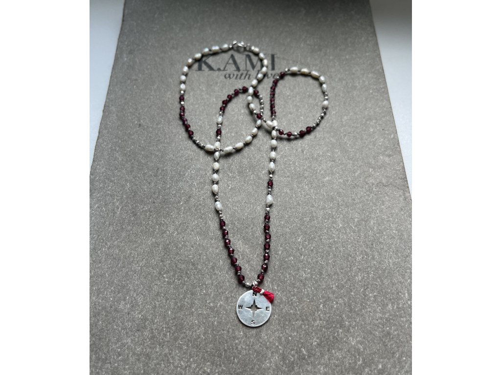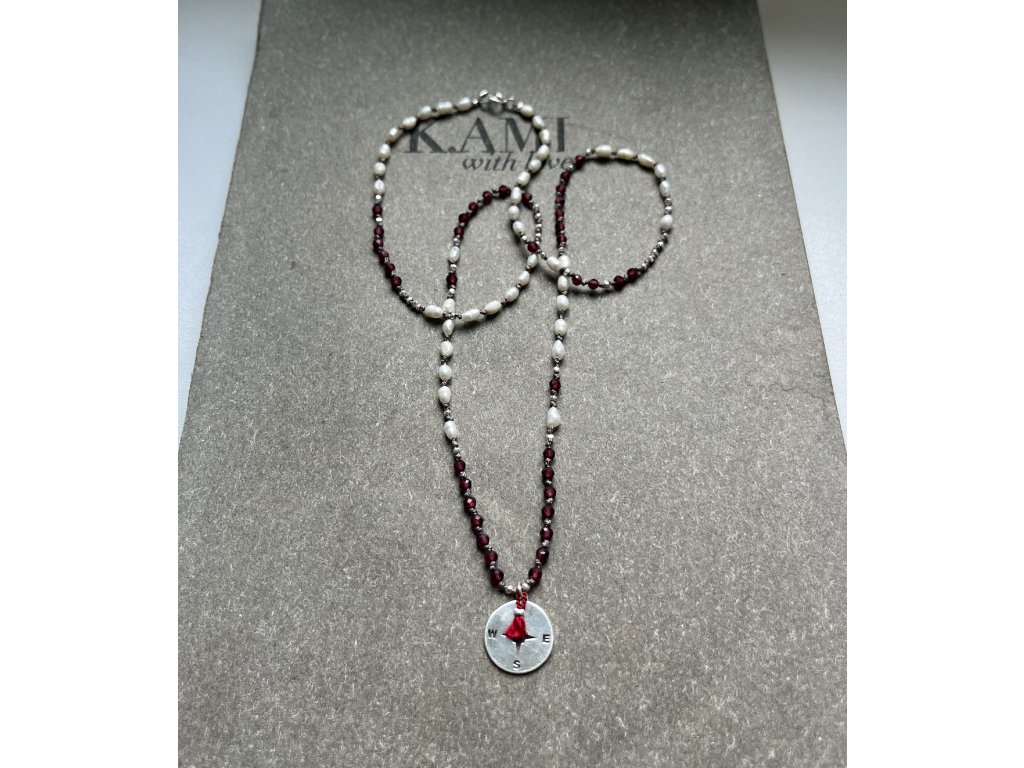 Řetízek z perliček a granátu se stříbrným kompasem Ag925