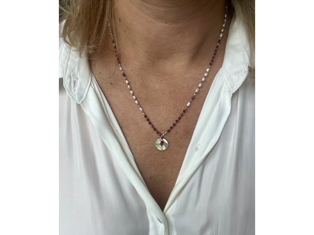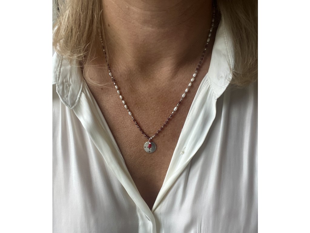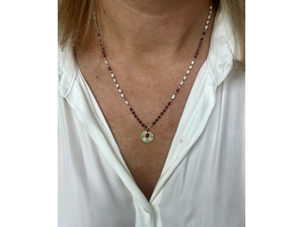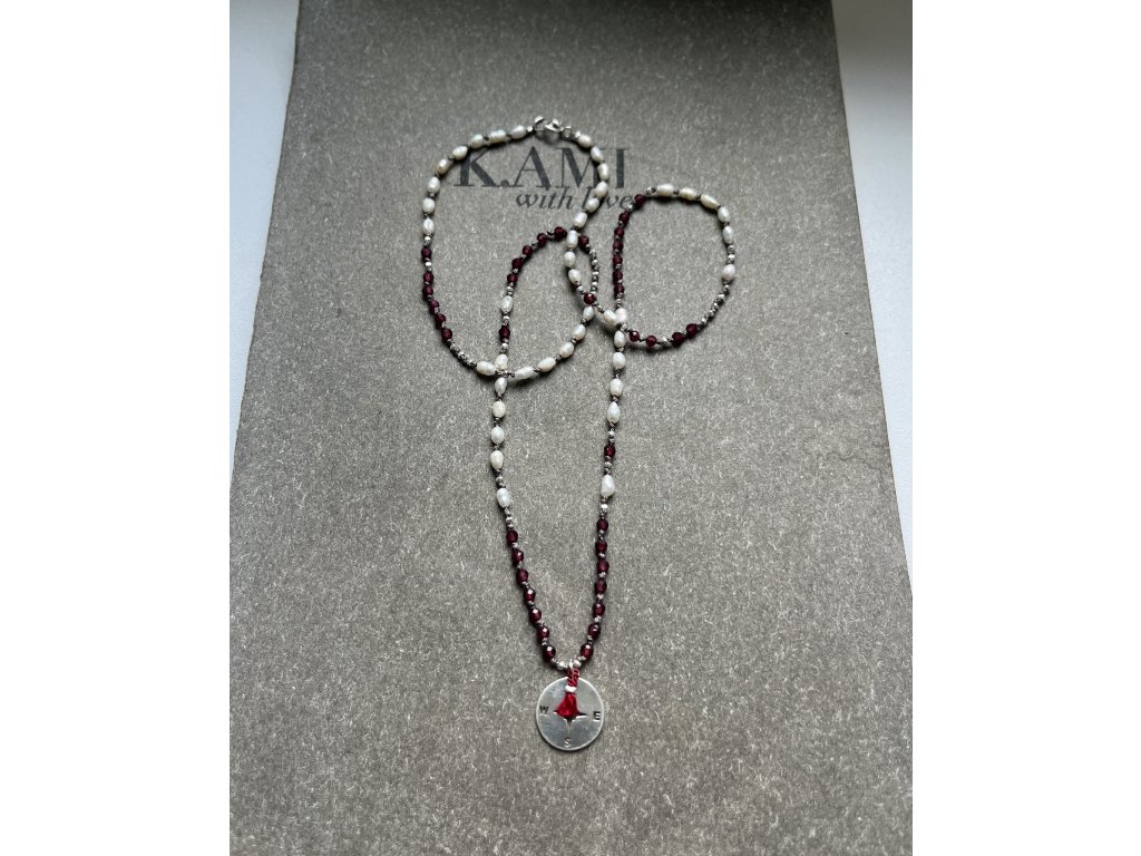 Krásný ručně dělaný řetízek z perliček, granátu a stříbrných fazet se stříbrným kompasem (Ag925), stříbrné zapínání (Ag925).