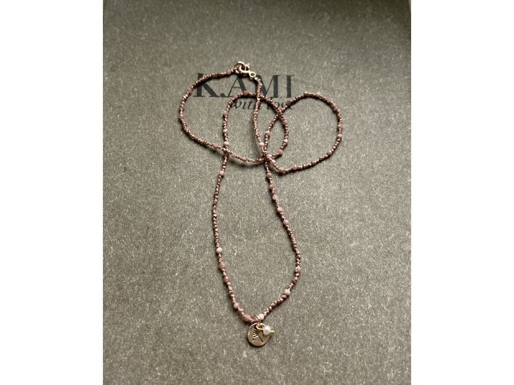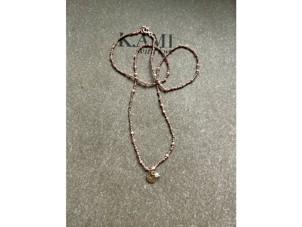 Řetízek z rodochrozitu a fazet zlacených růžovým zlatem se zlacenou pampeliškou (Ag925) a perličkou, zlacené zapínání (Ag925).