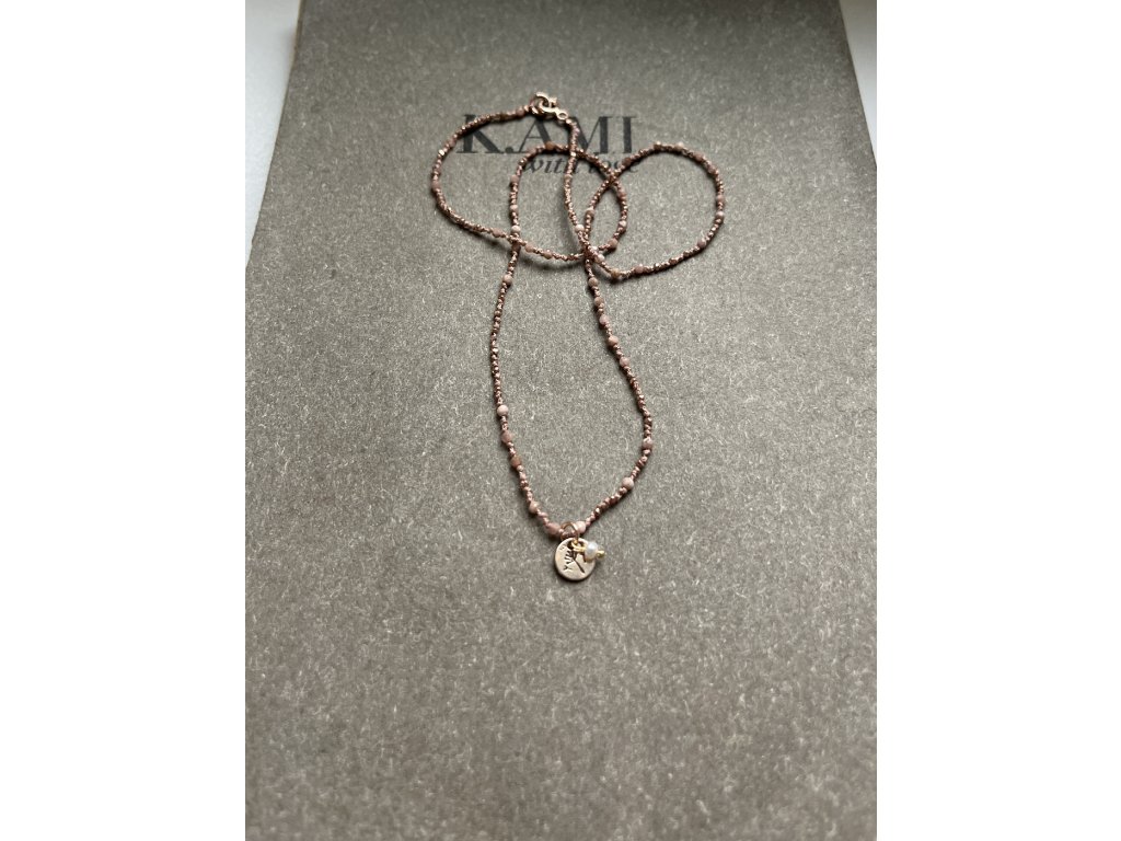 Ručně dělaný řetízek z japonských rokajlů, stříbrných fazet a rodochrozitu se stříbrným měsíčkem (Ag925) na šedé hedvábné šňůrce, stříbrné zapínání (Ag925). Obvod řetízku 46 cm.