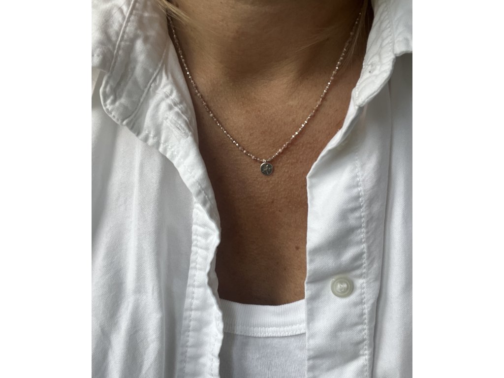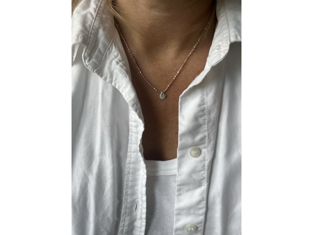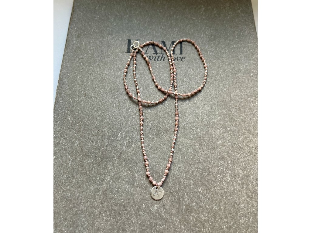 Ručně dělaný řetízek z rodochrozitu se stříbrnými fazetami a stříbrnou pampeliškou (Ag925), stříbrné zapínání (Ag925).