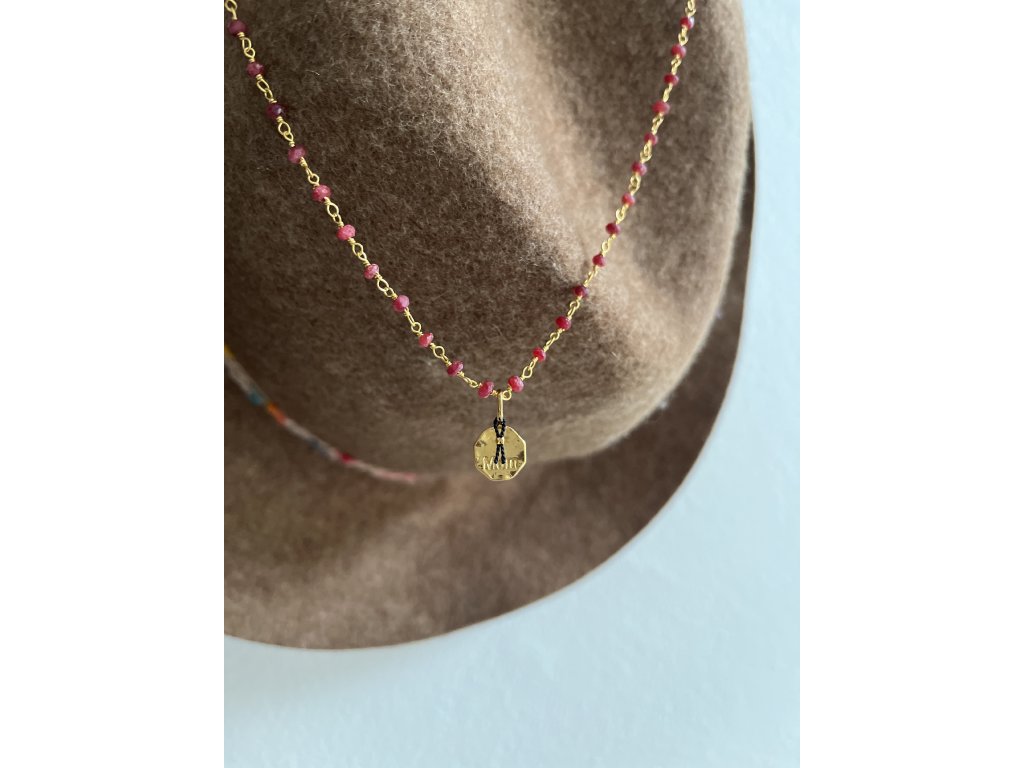 Řetízek z rubínu se zlaceným přívěskem MOM (Ag925, vermeil gold) a hedvábnou šňůrkou, zlacené zapínání (Ag925).