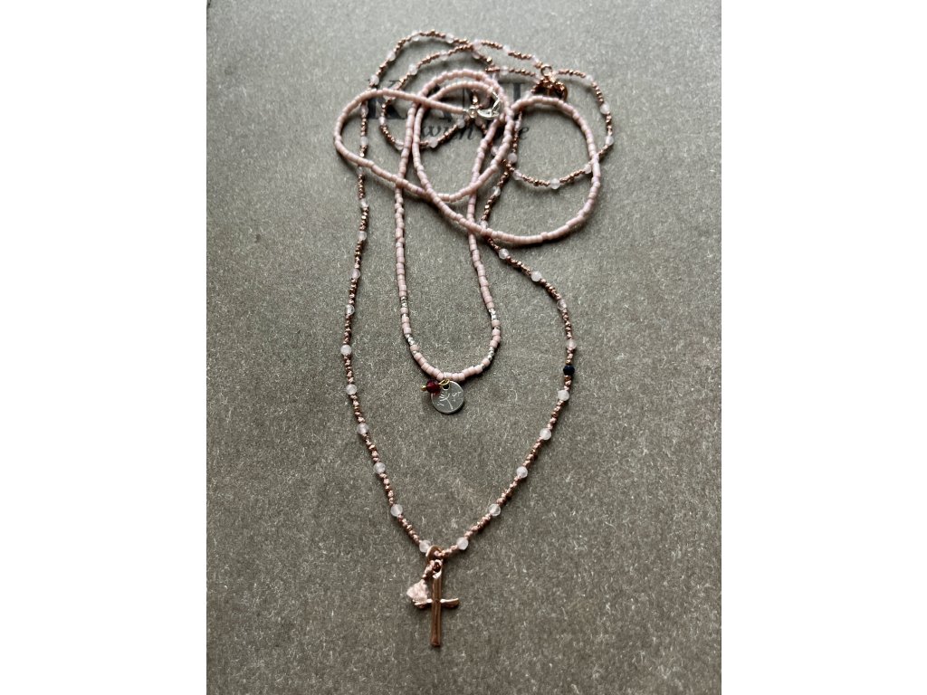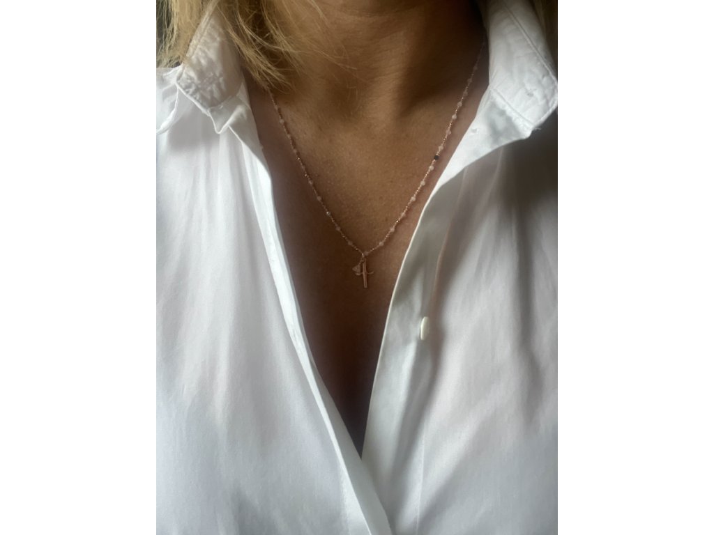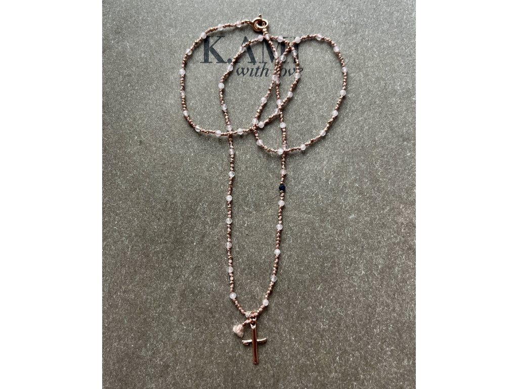 Ručně dělaný řetízek z broušeného růženínu s křížkem a fazetami zlacenými růžovým zlatem (Ag925) se safírem a střapečkem, zlacené zapínání (Ag925).