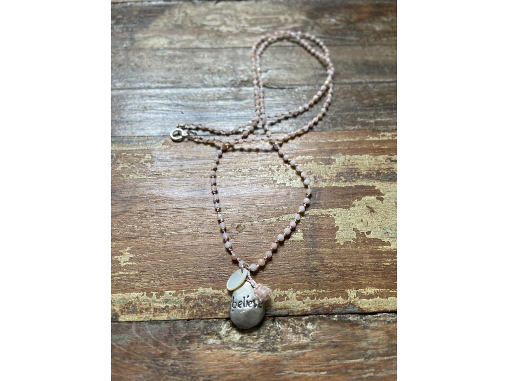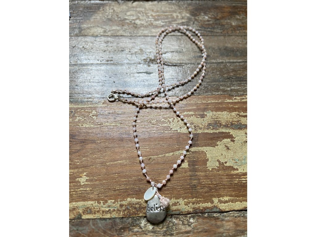 Řetízek z růžového opálu se stříbrným BELIEVE (Ag925), perletí a hedvábnou šňůrkou.