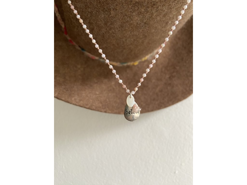 Jemný řetízek z růžového opálu se stříbrným BELIEVE (Ag925), perletí a hedvábnou šňůrkou.