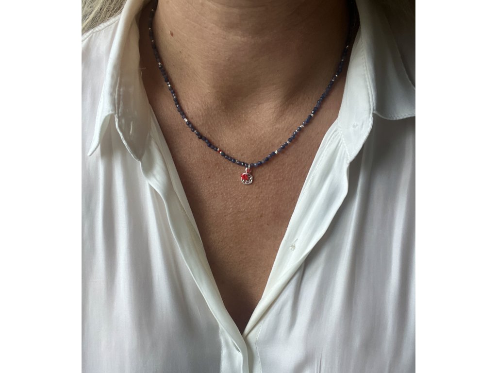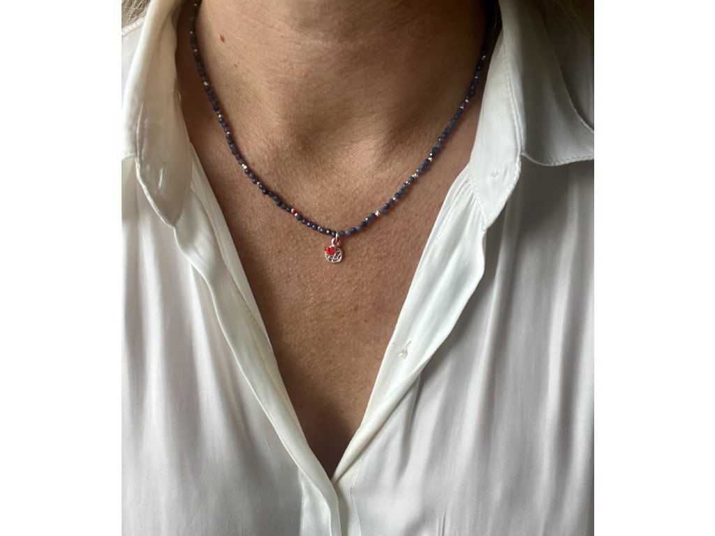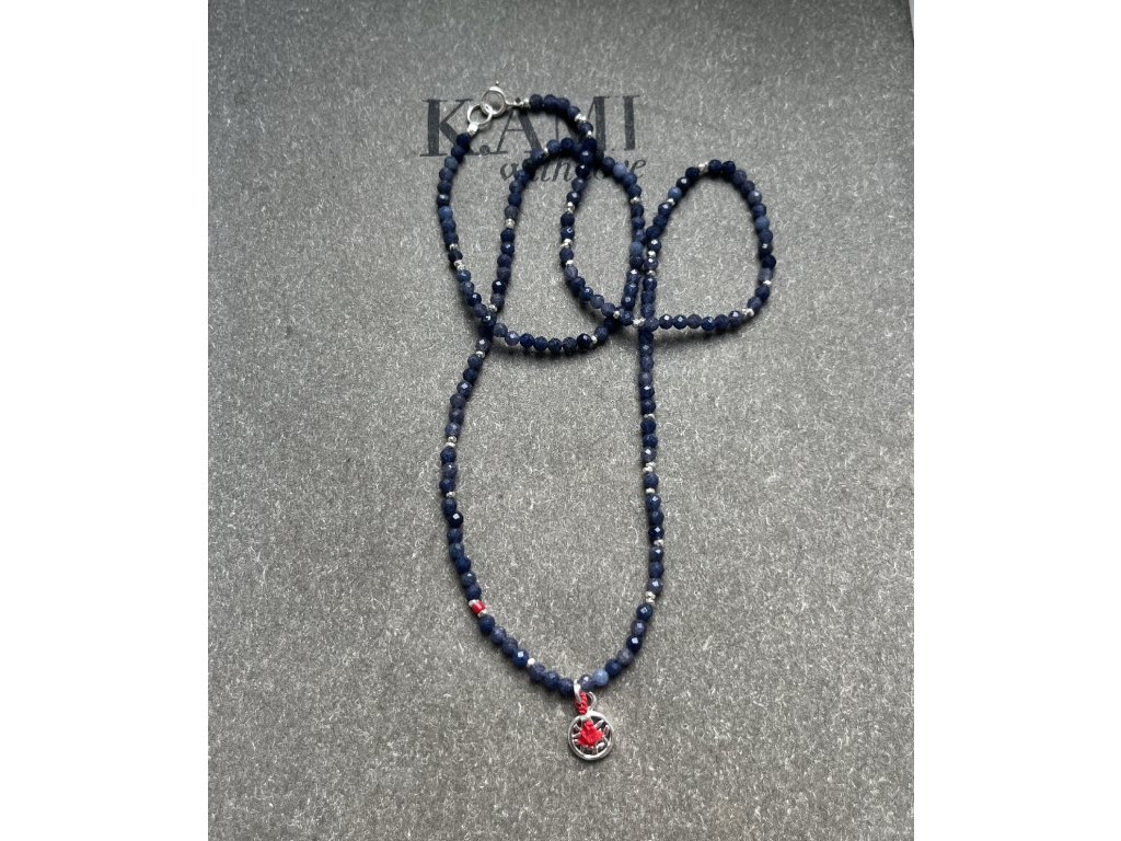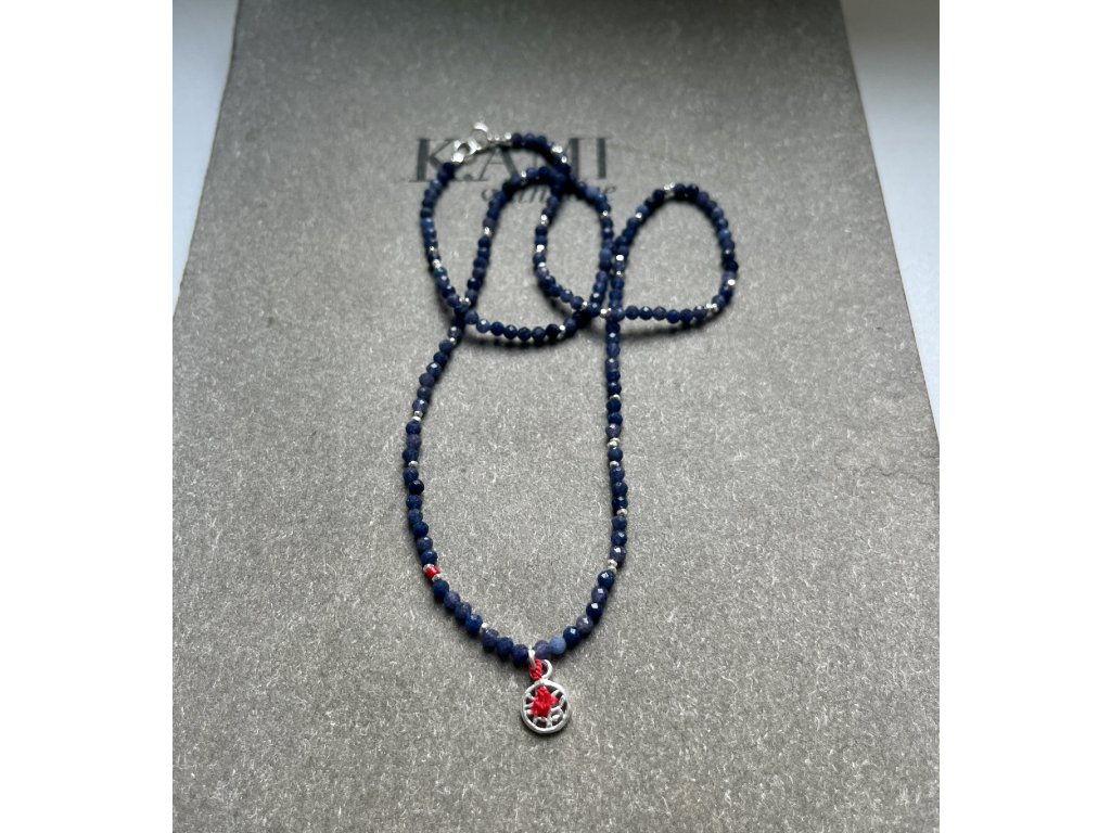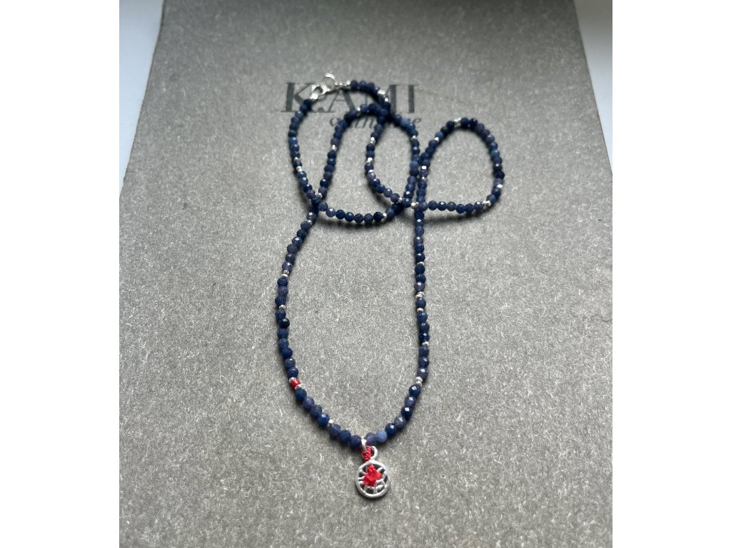 Řetízek z broušeného safíru se stříbrnými fazetami a stříbrným stromem života (Ag925), s japonským rokajlem a střapečkem z hedvábné šňůrky, stříbrné zapínání (Ag925). Obvod řetízku 43 cm.