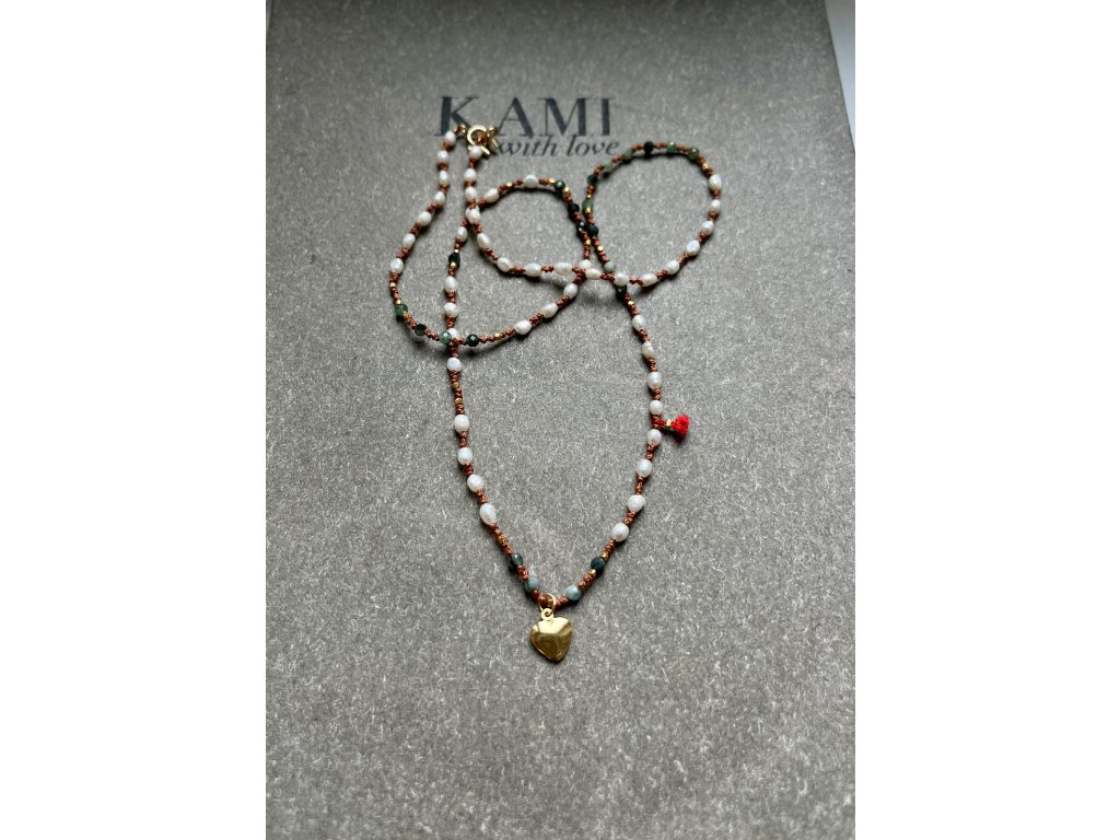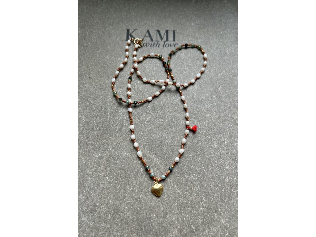 Řetízek ze smaragdu, perliček a zlacených fazet se srdíčkem Ag925