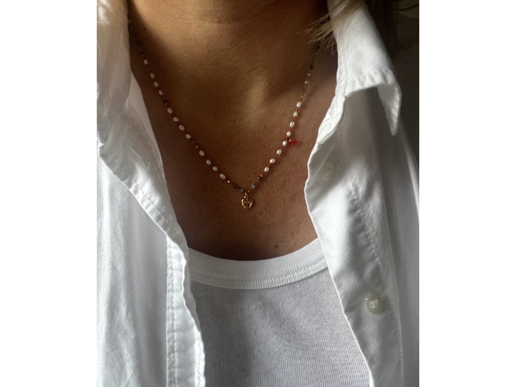 Ručně dělaný řetízek ze zlacených fazet, smaragdu a perliček se zlaceným srdíčkem (Ag925), zlacené zapínání (Ag925).
