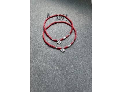 Náramek z ručně barvené hedvábné šňůrky se stříbrným srdíčkem (Ag925), úvaz na uzlík.