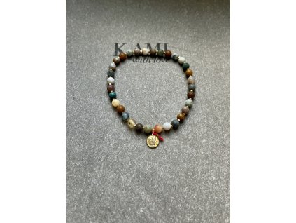 Náramek z oceánského jaspisu se zlaceným andělíčkem, zlacenými korálky a zlacenými fazetami (Ag925), pružný návlek. Obvod náramku cca 16-17 cm.