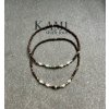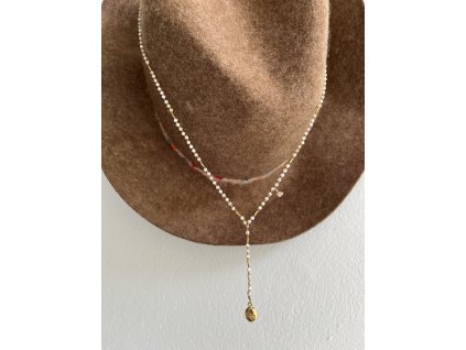 Krátký řetízek z hedvábné šňůrky se zlacenými fazetami (Ag925), bavlnkami a zlaceným zapínáním (Ag925). Obvod řetízku 40 cm. Velikost fazet 1,5 cm.