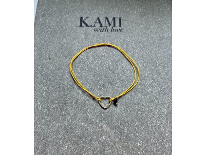 Náramek ze shambala šňůrky se zlacenými korálky, zlaceným srdíčkem (gold filled, Ag925) a rubínem, posuvný úvaz.