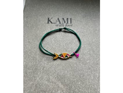 Rybička (zamak, smalt) na saténové šňůrce se střapečkem z hedvábné šňůrky se zlacenou fazetou, pohyblivý úvaz.